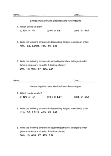 Ordering Fractions Decimals Percentages Worksheet Tes